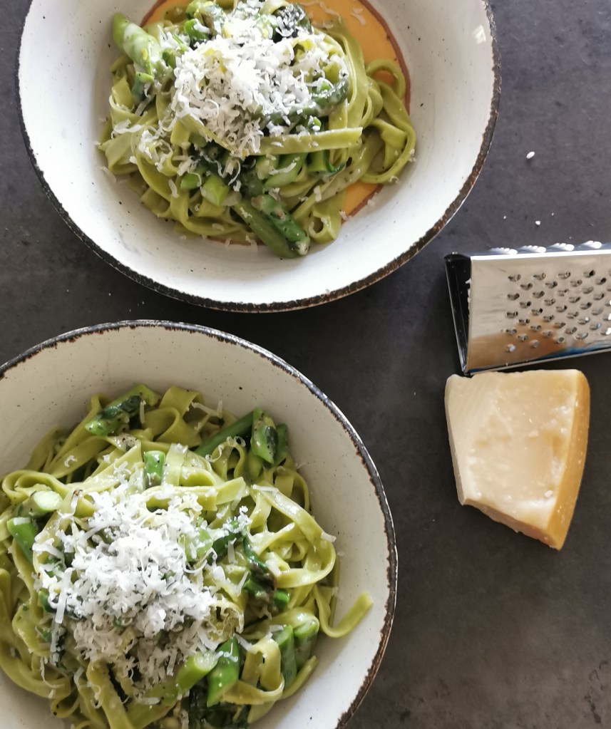 Häll först buljong i en tallrik, lägg dit pastan. Garnera med rikligt med riven parmesan, hackade rostade nötter och hackad persilja. Bon appétit!