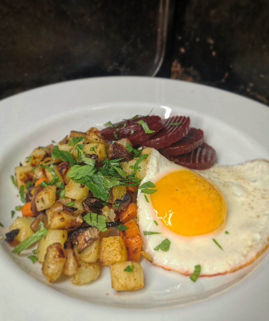 Skala och tärna alla grönsaker och koka i ca 8-10 minuter i saltat vatten. Hacka lök och vitlök. Skär svampen i skivor. Fräs samman dessa medan rotsakerna kokas, på hög värme. Häll i timjan. Sänk temperaturen till medelvärme. Häll av vattnet från rotsakerna och stek i en stekpanna med en klick smör. Lättast är att steka i omgångar så att det inte blir för mycket i stekpannan. När rotsakerna fått fin stekyta hälls det över i stekpannan med svampen och löken. Smaka av med salt och peppar. Stek lite ägg och servera med rödbetor! Lätt som en plätt och svinigt gott.