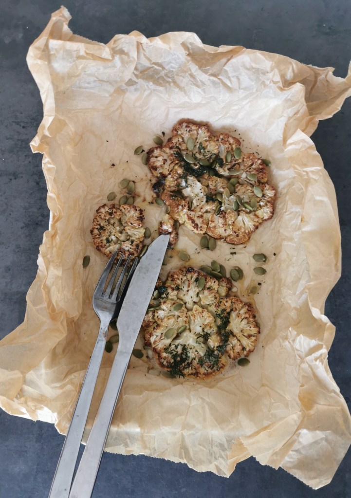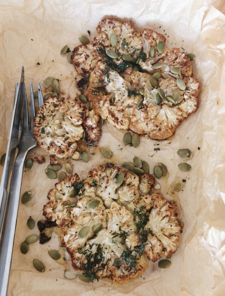 Skopa över smöret som smält ut, på blomkålen. Riv på rejält med parmesan. Bryt basilikabladen i mindre bitar. Sprinkla huvudet med basilikan och pumpakärnor. Servera med en klyfta citron till. Ät som det är eller servera med en god sallad och rostad potatis till. 😍