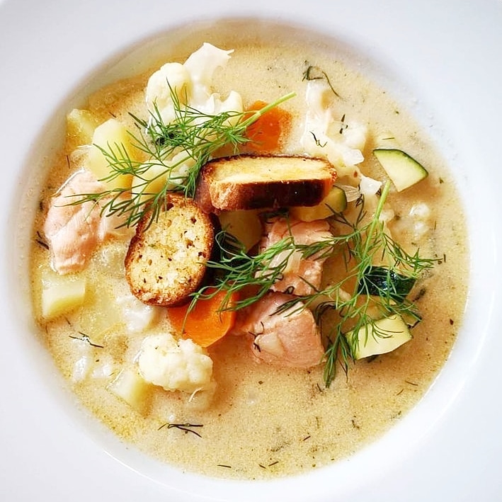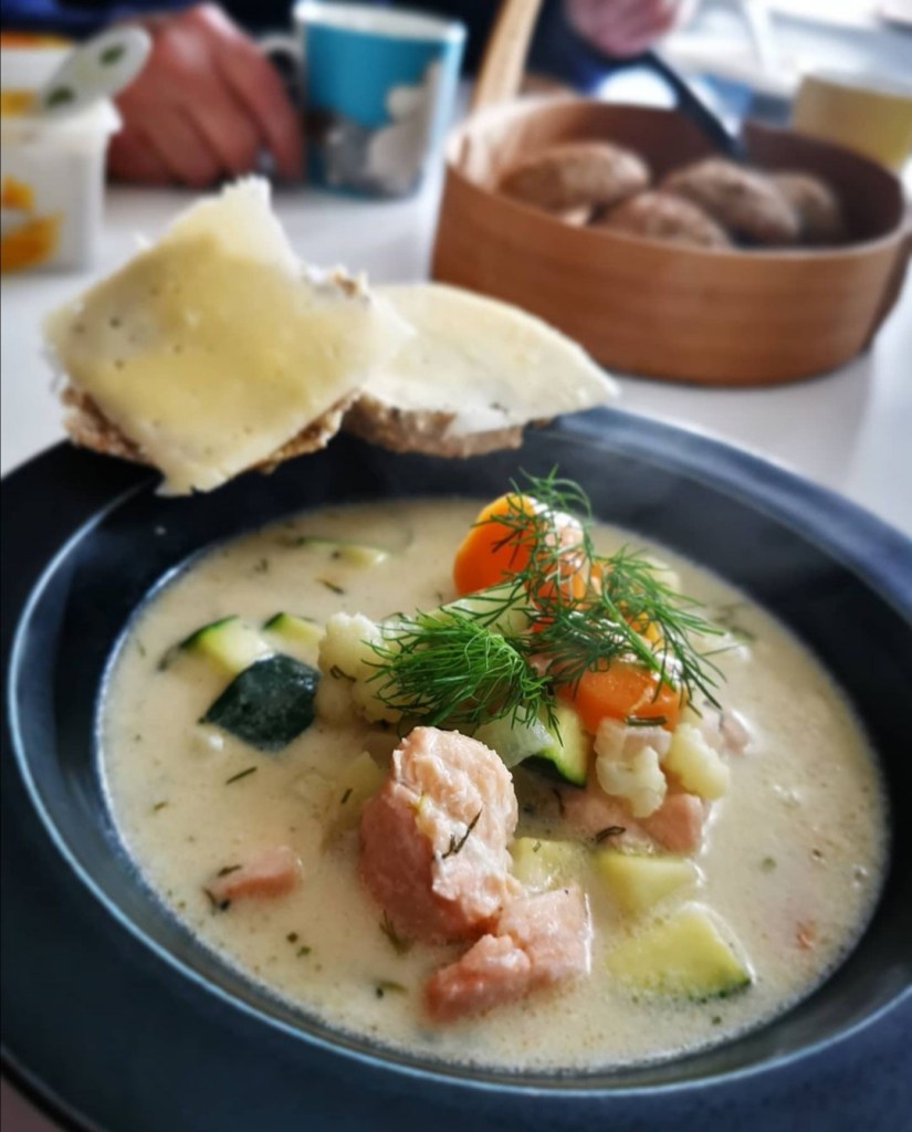 Sjud några minuter till och smaka av. Tillsätt eventuellt en buljongtärning till, salt och peppar. Släng sedan i laxen och låt sjuda ca två-tre minuter till. Servera direkt.